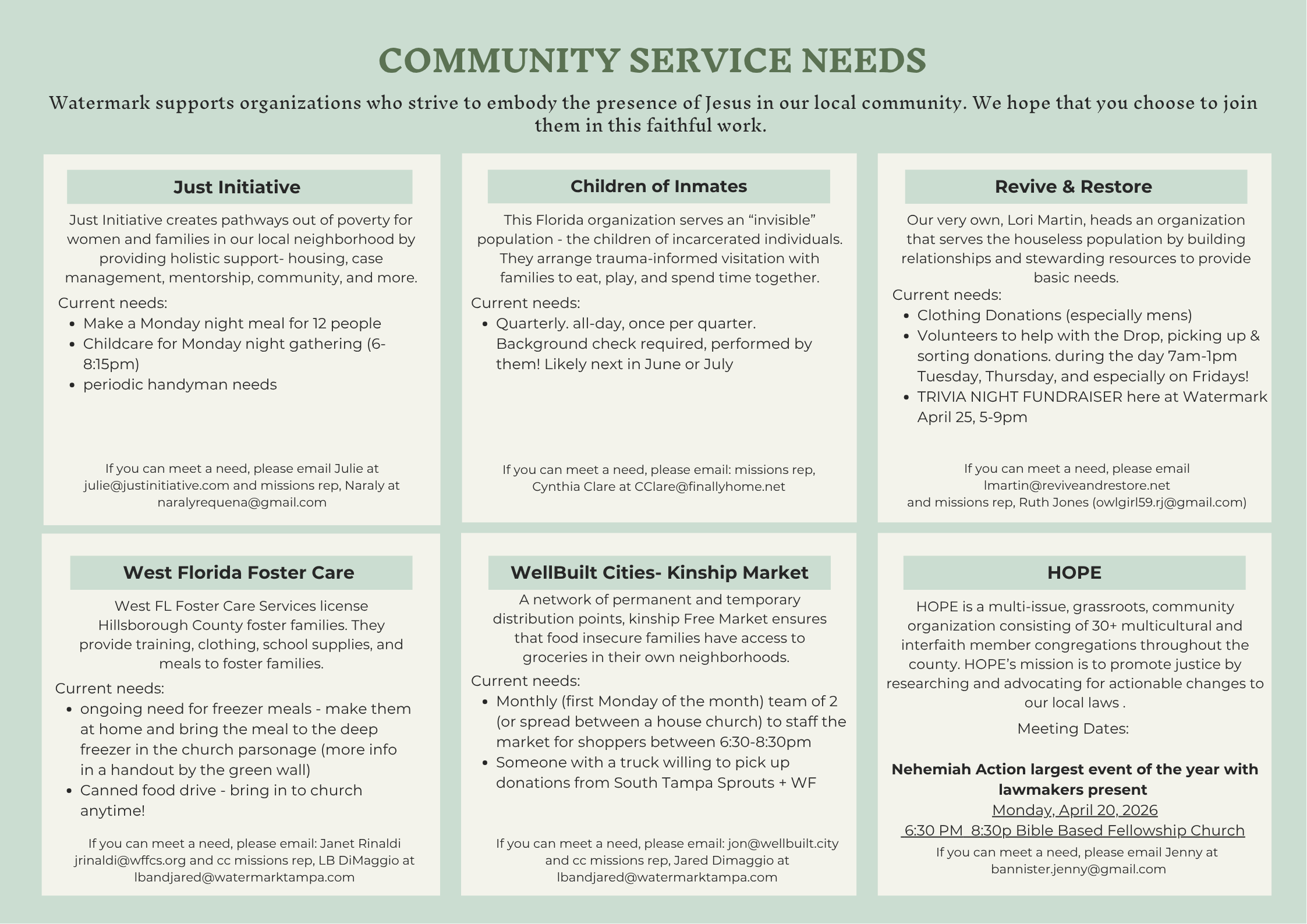 Get Involved with Just Initiative: Watermark is actively seeking volunteers to support this organization with tutoring, lawn care, general upkeep and handiwork, organizing clothing and donations, video editing/graphic design, mentoring and discipleship for local men, women and children, and more. If you are interested in serving this community in any of these ways, email Missions@watermarktampa.com.